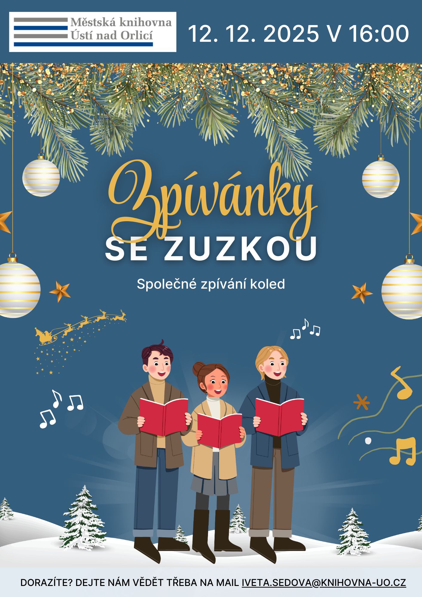 Přijďte si s námi zazpívat koledy. Chystáte se dorazit? Dejte nám prosím nezávazně vědět na mail iveta.sedova@knihovna-uo.cz či jiné sociální sítě.