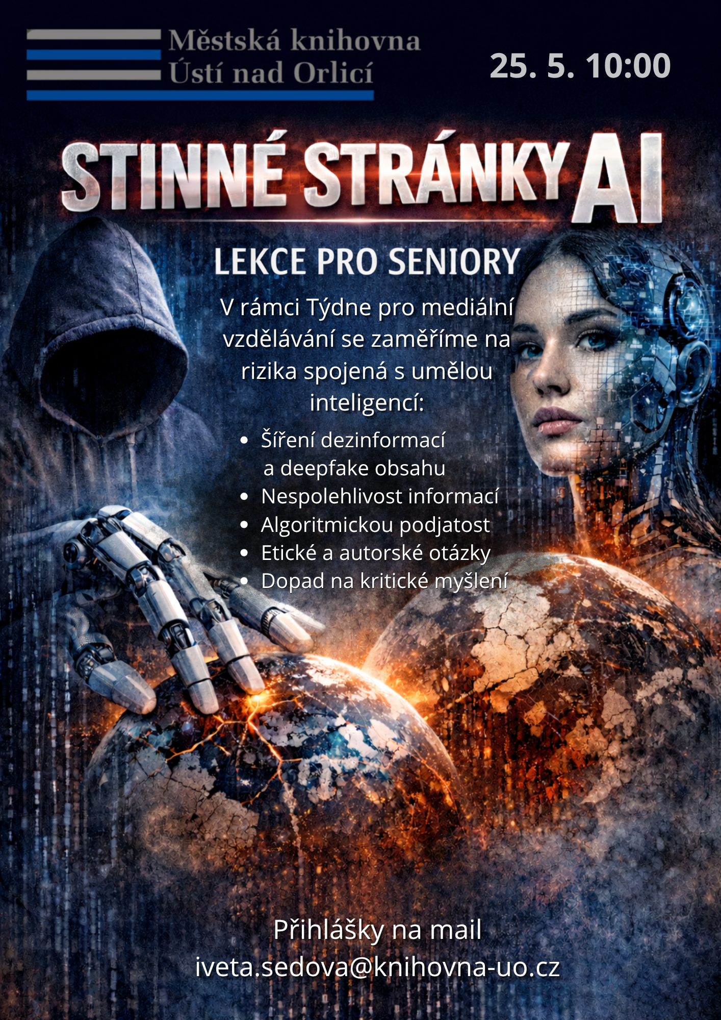 V rámci Týdne pro mediální vzdělávání se seznámíme se stinnými stránkami umělé inteligence, jako jsou šíření dezinformací a deepfaků, nespolehlivost informací, algoritmická podjatost, etické a autorské problémy či vliv na kritické myšlení. Přihlášky na mail iveta.sedova@knihovna-uo.cz.