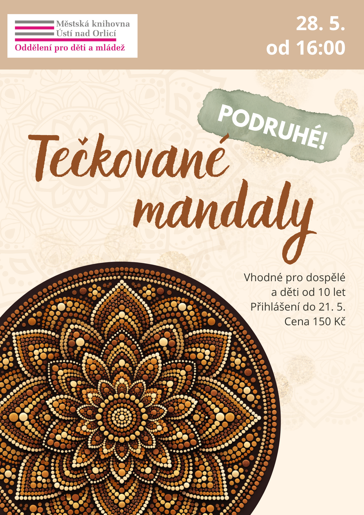 Pro velký zájem jsme se rozhodli uspořádat znovu kurz tečkovaných mandal. Kdo nestihl tuto báječnou tvořivou akci v lednu nebo si ji chce zopakovat, přihlaste se na náš květnový workshop :) Pro dospělé a děti od 10 let. Cena kurzu 150,– Kč.