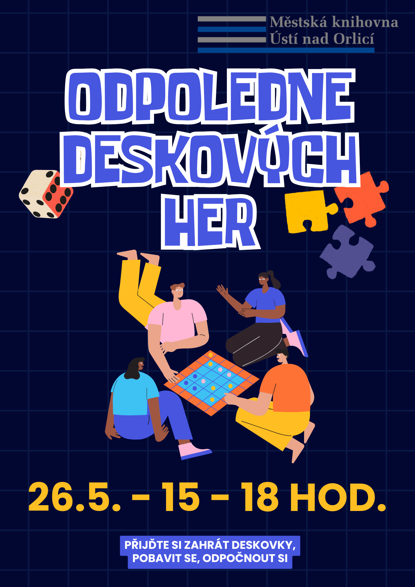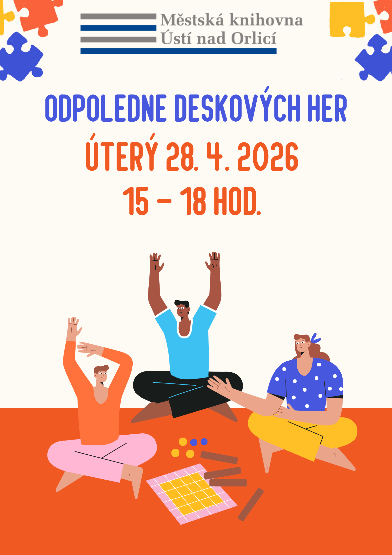 Čeká vás čtení, hraní i malé tvoření. Těšíme se na vás. Akce je vhodná pro děti od 3 do 8 let, předškoláci pouze s doprovodem. Prosíme o příspěvek 30 Kč na materiál.