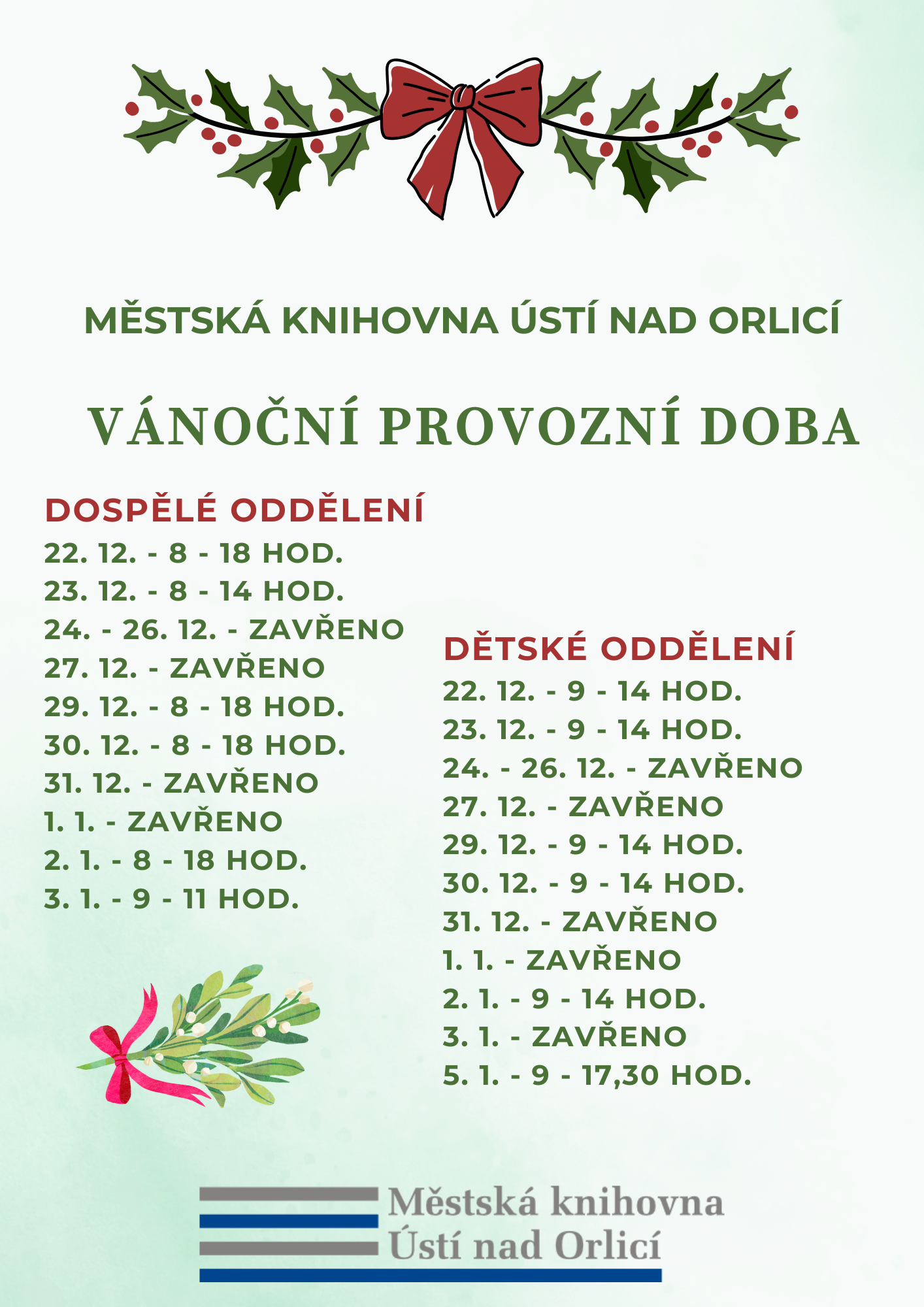 12. 12. – 16 hod. – Vánoční zpívánky se Zuzkou - Přijďte si s námi zazpívat koledy. Chystáte se dorazit? Dejte nám prosím nezávazně vědět na mail iveta.sedova@knihovna-uo.cz či jiné sociální sítě.