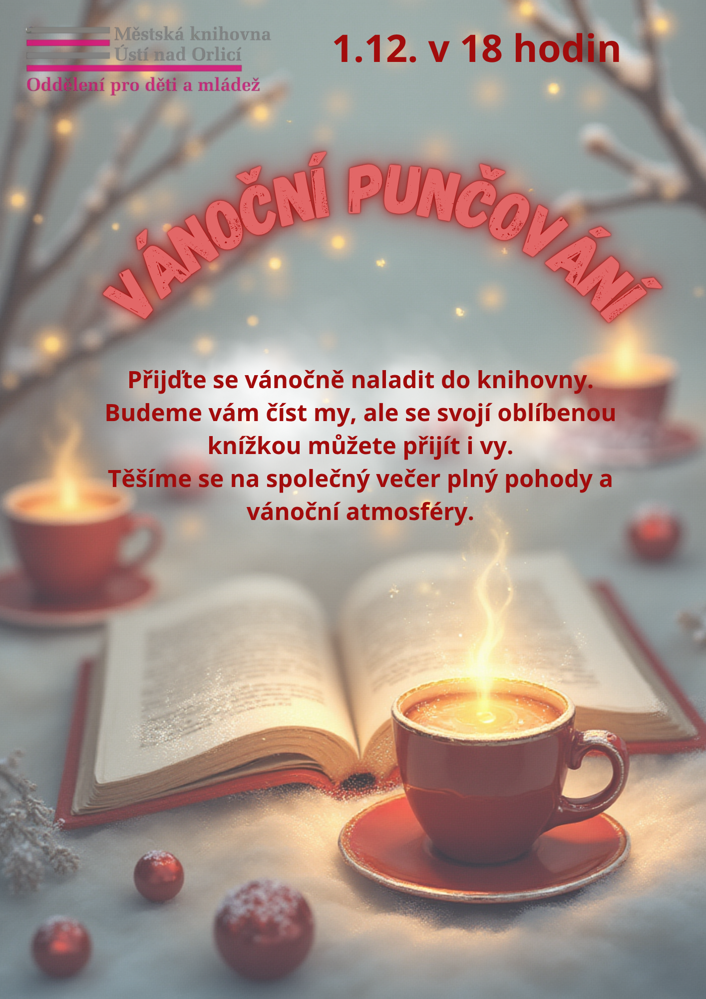 Přijďte se vánočně naladit do knihovny. Čeká vás velká dávka příběhů a k tomu malá dávka voňavého punče. Budeme vám číst my, ale se svojí oblíbenou knížkou můžete přijít i vy. Těšíme se na společný večer plný pohody a vánoční atmosféry.