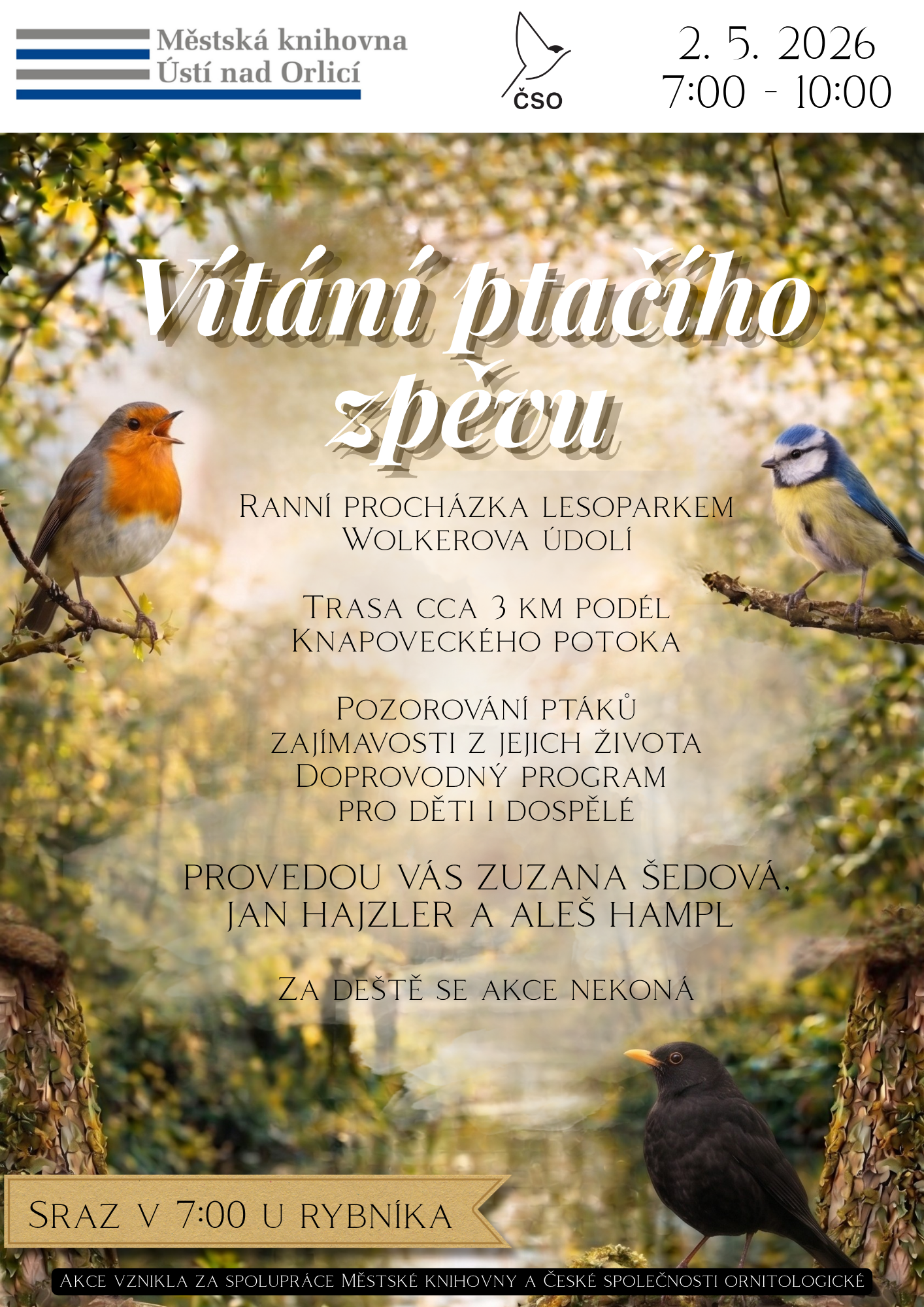 V sobotu 2. května, od 7:00 do přibližně 10:00, vás zveme na ranní procházku lesoparkem Wolkerova údolí. Společně se vydáme na zhruba tříkilometrovou trasu podél Knapoveckého potoka, během níž budeme pozorovat běžné druhy ptáků a dozvíme se o nich zajímavosti z jejich života. Součástí bude i doprovodný program pro malé i velké. Sraz je v 7:00 u rybníka ve Wolkerově údolí. V případě deště se akce nekoná. Akci pořádá Česká společnost ornitologická ve spolupráci s knihovnou.