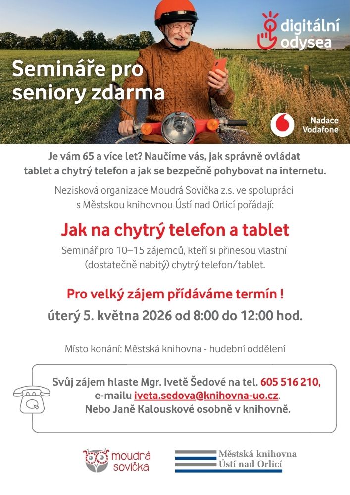 Pro velký zájem přidáváme další termín oblíbeného školení pro seniory, které pořádáme ve spolupráci s neziskovou organizací Moudrá sovička z. s.. Akce pro seniory nad 65 let zdarma po předchozím přihlášení na tel 605 516 210 či mailu iveta.sedova@knihovna-uo.cz. Počet míst omezen.