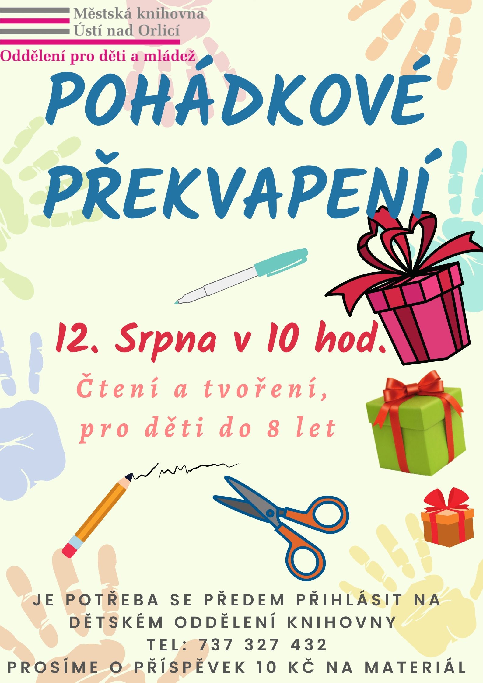 Pohádkové předčítání a tvoření vhodné pro děti do 8 let. Prosíme o příspěvek 10 Kč na materiál. Na akci je třeba se předem přihlásit na dětském oddělení (737 327 432).