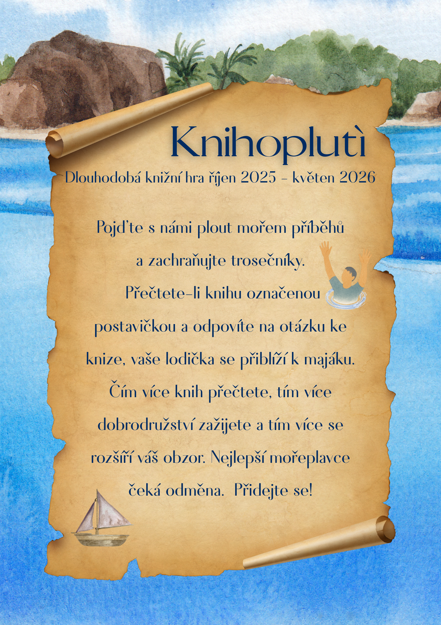 Pojďte s námi plout mořem příběhů. Přečtete-li knihu označenou postavičkou a odpovíte na otázku ke knize, vaše lodička popopluje blíže k majáku. Čím více knih přečtete, tím více dobrodružství zažijete a tím více se rozšíří váš obzor. Nejlepší mořeplavce čeká odměna. Plout s nám můžete až do konce května. Přidejte se.