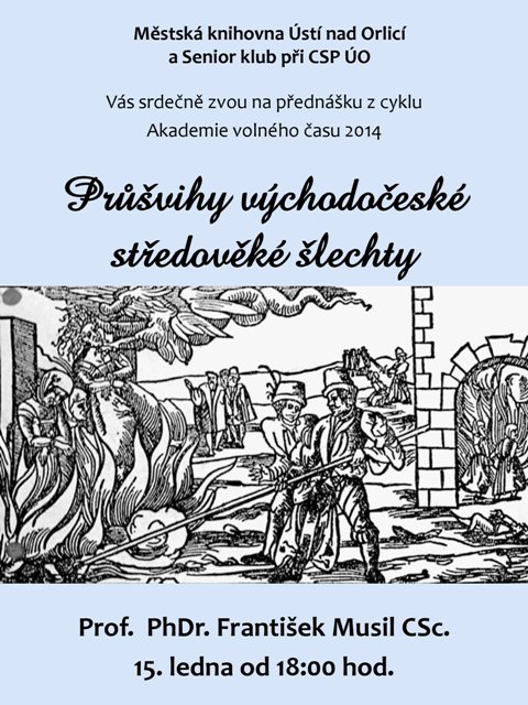 srdečně Vás zveme na první přednášku dalšího ročníku cyklu Akademie volného času. Pan prof. PhDr. František Musil, CSc. bude hovořit na téma Průšvihy východočeské středověké šlechty, a to 15. ledna od 18:00 hod.